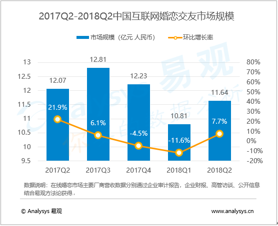 據(jù)Analysys易觀監(jiān)測數(shù)據(jù)顯示,2018年第2季度,中國互聯(lián)網(wǎng)婚戀交友市場規(guī)模達(dá)到11.64億元人民幣,較上季度增長7.7%。