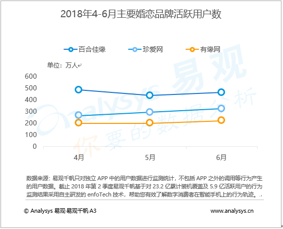 世紀(jì)佳緣和百合網(wǎng)的合并強(qiáng)化了在在線婚戀社交領(lǐng)域的覆蓋和領(lǐng)導(dǎo)地位。2018年4-6月,百合佳緣月均活躍用戶數(shù)已達(dá)462.3萬人,季活躍用戶領(lǐng)域滲透率31.6%。而排名第二的珍愛網(wǎng)和有緣網(wǎng)月均活躍用戶數(shù)則分別為293.9萬人和206.4萬人。