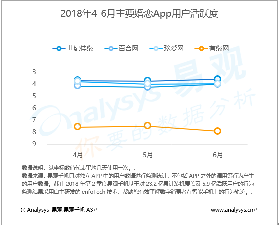 四大老牌婚戀應(yīng)用在用戶資源不斷傾斜的背景下,用戶活躍度已持續(xù)穩(wěn)定。在四大主流婚戀App中,二季度世紀(jì)佳緣以用戶平均每月每3.7天使用一次的活躍度,位居行業(yè)第一。珍愛網(wǎng)和百合網(wǎng)的用戶活躍度緊隨其后,與排名第四的有緣網(wǎng)逐大幅拉開差距。