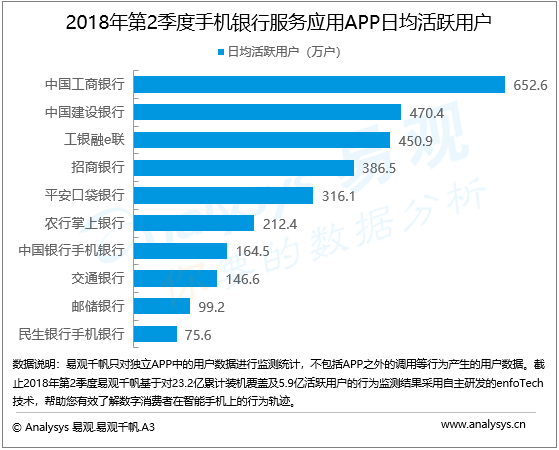 根據(jù)Analysys易觀發(fā)布的《銀行服務(wù)應(yīng)用APP季度監(jiān)測報告2018年第2季度》數(shù)據(jù)顯示,從日均活躍用戶規(guī)模來看,中國工商銀行、中國建設(shè)銀行、工銀融e聯(lián)分別以652.6萬戶、470.4萬戶、450.9萬戶繼續(xù)位居前三位。