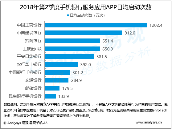從日均啟動次數(shù)來看,中國工商銀行達(dá)1202.4萬次,其次是中國建設(shè)銀行912.0萬次、招商銀行651.4萬次。
