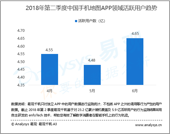 根據(jù)易觀千帆最新數(shù)據(jù)顯示,2018年第二季度,中國手機(jī)地圖APP領(lǐng)域活躍用戶雖在季度中期出現(xiàn)小幅波動,但總體規(guī)模較上一季度仍保持快速增長。其中,2018年4月活躍用戶數(shù)4.55億,環(huán)比增長2.64%,2018年5月活躍用戶數(shù)4.48億,環(huán)比下降1.58%,2018年6月活躍用戶數(shù)4.65億,環(huán)比增長3.95%。