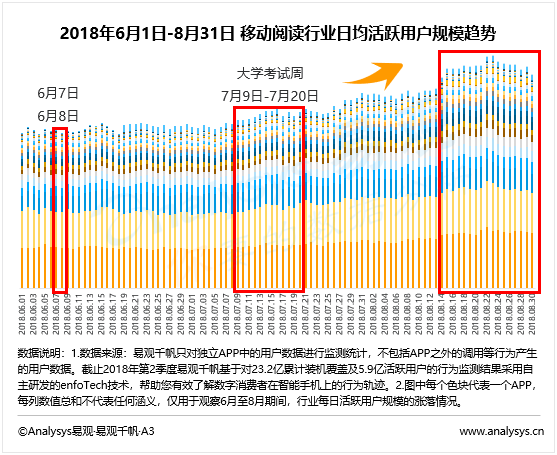 暑假開始后,用戶規(guī)??焖倮?,且活躍用戶規(guī)模在8月下旬達到階段內(nèi)頂峰。此時閱讀平臺以活動運營和產(chǎn)品運營為主來拉新促活,同時保持用戶粘性。比如:塔讀文學APP于8月上線5.1新版本,豐富了用戶標簽以達到為用戶推送精準內(nèi)容的目的,同時推出了新用戶免費閱讀21天的活動和一元閱讀的活動,降低了新用戶的體驗成本,取得較高的用戶增量。