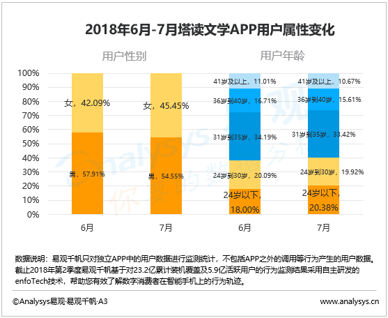 再以塔讀文學APP為例,其在暑假期間,IP影視化的《曼陀花開》進入后期制作,IP影視化的《奈何Boss要娶我》開機,IP影視化的《法醫(yī)秦明2》熱播,這幾部IP均是以女性為主的作品,在女性用戶的帶動下,塔讀文學APP女性用戶增長了3個百分點,占比達到45.45%。