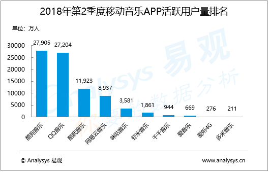 從2018年第2季度各家移動音樂類APP的活躍用戶數(shù)據(jù)來看,騰訊音娛系在線音樂平臺的領(lǐng)先地位依然穩(wěn)固。整體上,各家APP基本延續(xù)了近年來的發(fā)展趨勢,酷狗音樂、QQ音樂、酷我音樂三大在線音樂平臺的活躍用戶量穩(wěn)居市場前三,值得注意的是,QQ音樂在活躍用戶上的增速較快,已逐漸接近酷狗音樂,或有望在年內(nèi)趕超。