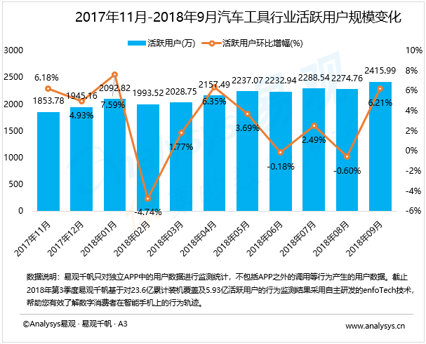 從2017年11月份以來,汽車工具行業(yè)整體保持高速發(fā)展態(tài)勢,月復合環(huán)比增速保持在3%左右。2018年9月,汽車工具行業(yè)總體活躍用戶規(guī)模為2451.99萬,9月環(huán)比增速達到6.21%。受到“金九銀十”的新車銷量增長影響,更多新用戶需要辦理汽車保險等服務,環(huán)比增速顯著高于之前月份。