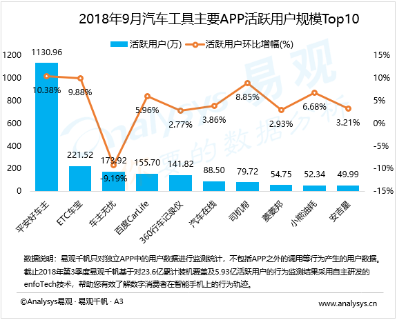 9月,平安好車主活躍用戶規(guī)模為1130.96萬,環(huán)比增速高達10.38%,領先同行業(yè)中其他廠商。ETC車寶、車主無憂以221.62萬和173.92萬的活躍用戶規(guī)模分列汽車工具行業(yè)二、三位。另外前十名廠商還有百度Carlife、360行車記錄儀、汽車在線、安吉星等多家車聯(lián)網(wǎng)企業(yè)的APP端,這些APP借助車載OBD或車聯(lián)網(wǎng)系統(tǒng)實現(xiàn)了車況監(jiān)控、遠程控制等功能,這些功能提升了汽車的安全性和便捷性,推動了汽車行業(yè)的智能化進程。