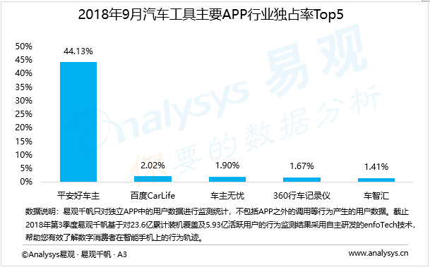 行業(yè)獨占率是每個APP在該行業(yè)的核心用戶比例(該行業(yè)中只安裝此APP的比例)。其中平安好車主的行業(yè)獨占率在9月達到了44.13%,大幅領先于同行業(yè)的其他APP。其他主要汽車工具類APP的核心用戶數(shù)量相對較少,主要是因為車聯(lián)網(wǎng)還處于發(fā)展前期,產(chǎn)品功能還不夠完善,隨著技術的不斷成熟,預計未來汽車工具市場將具有更多發(fā)展空間。