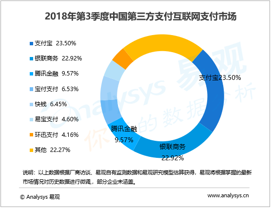 第三方互聯(lián)網(wǎng)支付市場競爭格局仍然延續(xù)上季度排名,支付寶以23.50%繼續(xù)保持互聯(lián)網(wǎng)支付市場第一名,銀聯(lián)支付保持行業(yè)第二的位置,市場占有率達到22.92%;騰訊金融以9.57%的市場占有率位列第三,前三家機構(gòu)共占據(jù)互聯(lián)網(wǎng)支付行業(yè)交易份額的55.99%。
