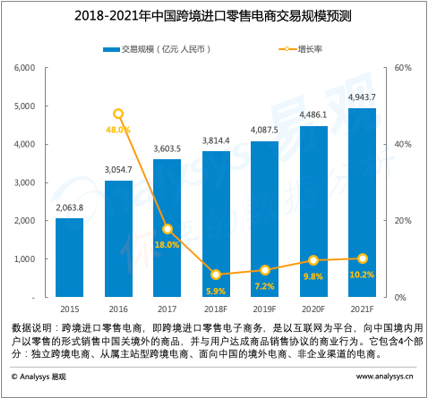 根據(jù)Analysys易觀發(fā)布的數(shù)據(jù)顯示,預(yù)計在2019年,中國跨境進(jìn)口零售電商交易規(guī)模將達(dá)到4087.5億元人民幣,環(huán)比增長7.2%。預(yù)計到2021年,中國跨境進(jìn)口零售電商交易規(guī)模將達(dá)到4943.7億元人民幣。