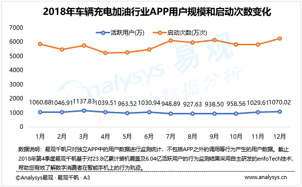 2018年,車(chē)輛充電加油行業(yè)整體處于一個(gè)比較平穩(wěn)的發(fā)展階段。行業(yè)用戶規(guī)模保持在1000萬(wàn)左右,全年并無(wú)明顯的變化,總體啟動(dòng)次數(shù)在6000萬(wàn)左右,全年啟動(dòng)次數(shù)略有增長(zhǎng)。