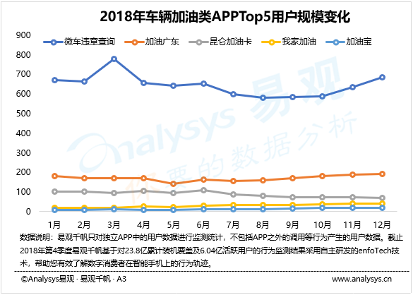 2018年,加油類(lèi)APP的用戶規(guī)模仍然占據(jù)車(chē)輛加油充電行業(yè)的主體。在2014年-2017年之間,加油類(lèi)APP經(jīng)歷了第一波高速增長(zhǎng),到2018年市場(chǎng)洗牌基本完成,用戶規(guī)模和市場(chǎng)格局逐漸穩(wěn)定。