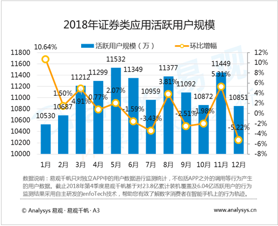 2018年,證券市場受金融監(jiān)管去杠桿、股權(quán)質(zhì)押風(fēng)險(xiǎn)加大、外圍市場大幅度回調(diào)等因素影響,指數(shù)連續(xù)下跌,影響了證券投資者入市熱情,4季度活躍用戶規(guī)模小幅下調(diào),全年移動端平均月活規(guī)模約為1.1億。
