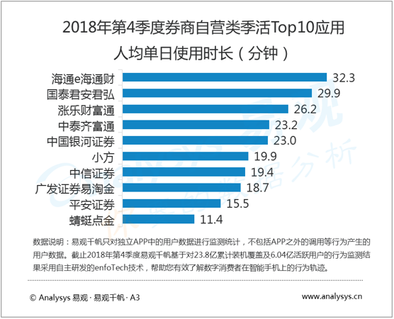 在均單日使用時長方面,海通e海通財(cái)以人均單日使用32.3分鐘列行業(yè)第一,其次是國泰君安君弘和漲樂財(cái)富通。