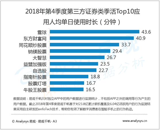 對比來看,券商自營類應(yīng)用人均單日使用時長的差距不大,主要是功能相對趨同,而第三方證券類應(yīng)用的差距相對較大,雪球以43.6分鐘的人均單日使用時長列行業(yè)第一,其次是東方財(cái)富網(wǎng)和同花順,鈉鎂股票本季度人均單日使用時長大幅度提升。