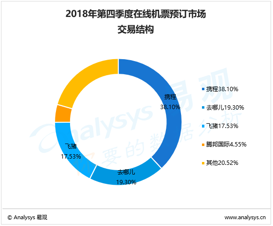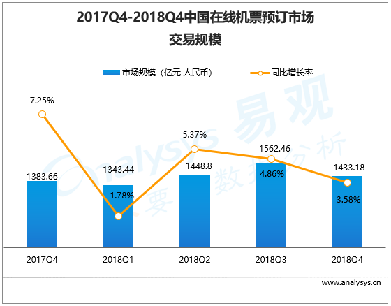 根據(jù)Analysys易觀發(fā)布的《中國在線機(jī)票預(yù)訂市場季度監(jiān)測分析2018年第4季度》顯示,2018年第4季度,中國在線機(jī)票預(yù)訂市場規(guī)模達(dá)到1433.18億元人民幣,同比增長3.58%,增幅再次縮小。