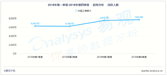 根據(jù)易觀千帆數(shù)據(jù),2018年,手機銀行服務(wù)行業(yè)活躍用戶規(guī)模保持增長態(tài)勢,2018年第4季度已達3.57億戶。從具體APP應(yīng)用角度看,如以工行手機銀行“中國工商銀行APP”為例,2018年第4季度活躍用戶規(guī)模為7691.8萬戶,位居行業(yè)首位,環(huán)比增長2.3%。