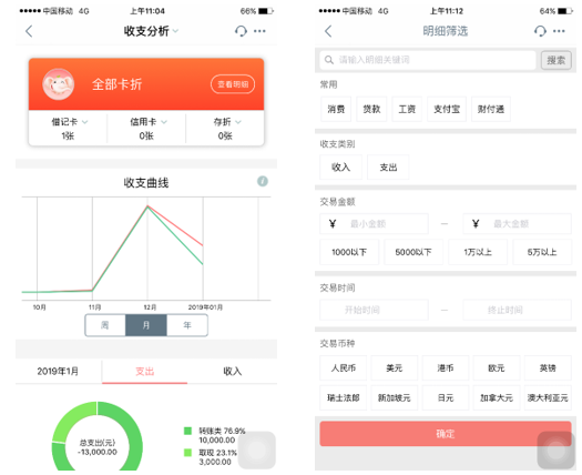 “隨心查”為個人客戶提供賬務(wù)靈活查詢與分析服務(wù),以客戶為中心,從客戶視角對賬務(wù)進行分類、檢索和追溯。支持“4維靈活查詢,5年賬務(wù)追溯,19類收入,23類支出”,同時支持查詢支付寶、財付通等第三方快捷的專項收支查詢,還可個性化定制關(guān)鍵詞、智能化生成月/周度報告,圖形化展現(xiàn)趨勢,幫助客戶合理安排個人金融收支計劃。