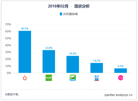 由于春節(jié)期間配送停止,2月食行生鮮月活環(huán)比下降較多。從活動運(yùn)營方面看,為了應(yīng)對春節(jié)期間的不能送貨帶來的影響,食行利用“請你吃小番茄”品類折扣、“3倍積分”福利、“開門紅包”三大活動力爭春節(jié)后返市流量。同時,食行也開始試水線下業(yè)務(wù),第一家食行生鮮工廠店在蘇州試營業(yè),未來線下門店或?qū)⒊蔀槭承匈I菜場景補(bǔ)充的重要一環(huán)。本月食行生鮮用戶人均月度使用天數(shù)達(dá)到11.4天,用戶活躍度為2.5,用戶粘性指標(biāo)位列榜首。從次月留存看,食行生鮮以32.8%的次月留存率排在第二位。