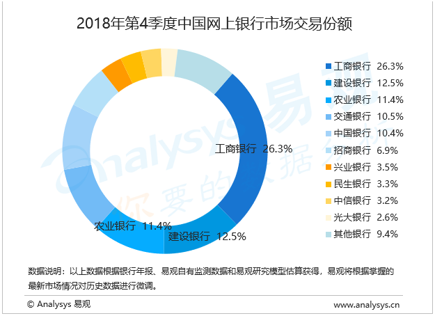 在2018年第4季度中國網上銀行市場格局中,工行、建行、農行、交行、中行五家大型國有銀行合計擁有71.1%的市場份額,招商銀行以6.9%的市場份額位居第六位。