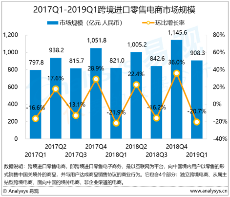 根據(jù)Analysys易觀發(fā)布的《中國跨境進口零售電商市場季度監(jiān)測報告2019年第1季度》數(shù)據(jù)顯示,2019年第1季度,中國跨境進口零售電商市場規(guī)模為908.3億元,環(huán)比下降20.7%。
