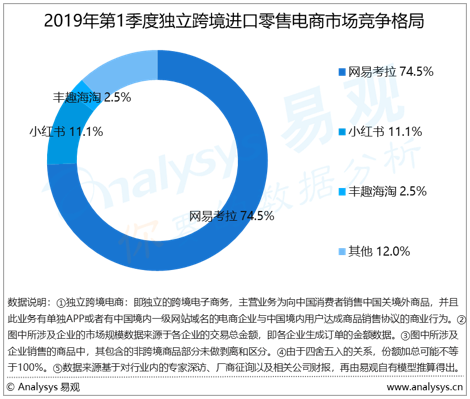 1季度獨立跨境進口零售電商的競爭態(tài)勢:網(wǎng)易考拉排名第一,份額為74.5%。小紅書排名第二,份額為11.1%。豐趣海淘排名第三,份額為2.5%。