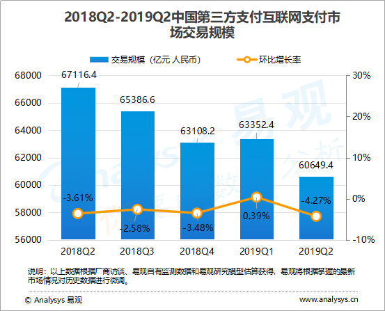 根據(jù)易觀近期發(fā)布的 《中國第三方支付互聯(lián)網(wǎng)支付市場季度監(jiān)測報告2019年第2季度》數(shù)據(jù)顯示,2019年第2季度中國第三方支付互聯(lián)網(wǎng)支付市場交易規(guī)模為60649.4億元人民幣,環(huán)比降低4.27%。