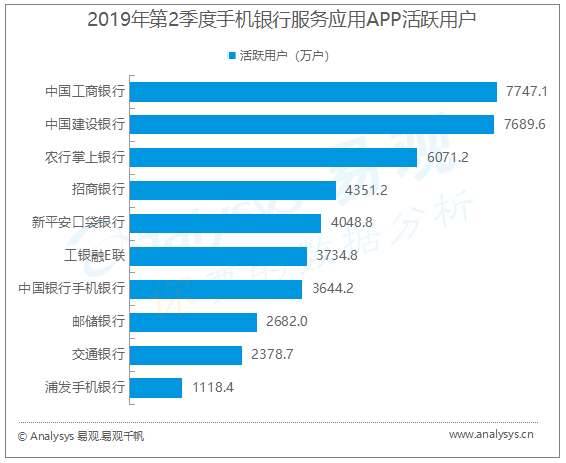 Analysys易觀分析認為,與手機銀行總注冊用戶數(shù)穩(wěn)定增長一樣,手機銀行活躍用戶規(guī)模也呈增長態(tài)勢,第2季度,手機銀行版本更新的增多,功能優(yōu)化及活動等方面的運營提升,帶動活躍用戶增長。
