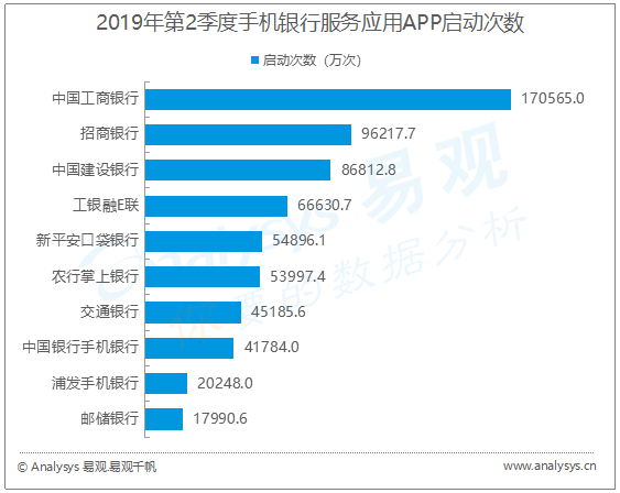 從2019年第2季度啟動次數(shù)來看,中國工商銀行APP達17.1億次,其次是招商銀行APP為9.6億次、中國建設(shè)銀行APP為8.7億次。分析認為,招商銀行APP啟動次數(shù)位列行業(yè)第二,其著力拓展餐飲、娛樂、出行、城市服務(wù)等生活場景,提高用戶使用頻次及粘性,同時通過新戶專享禮、月月有好禮、推薦好友禮等常態(tài)化的活動促進用戶粘性提升。