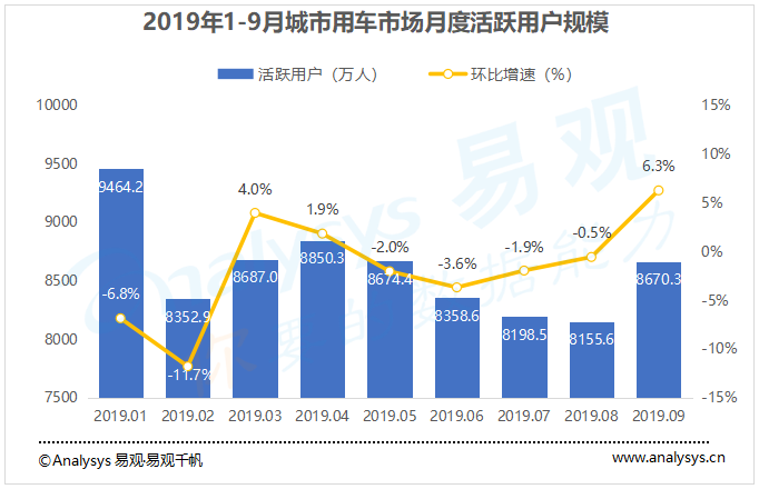 Analysys易觀分析認為,由于嚴格政策監(jiān)管環(huán)境對網約車行業(yè)供給端造成階段性沖擊,以及宏觀經濟放緩使得網約車行業(yè)需求端承壓,2019年1-9月中國城市出行行業(yè)活躍用戶規(guī)模出現(xiàn)一定波動。