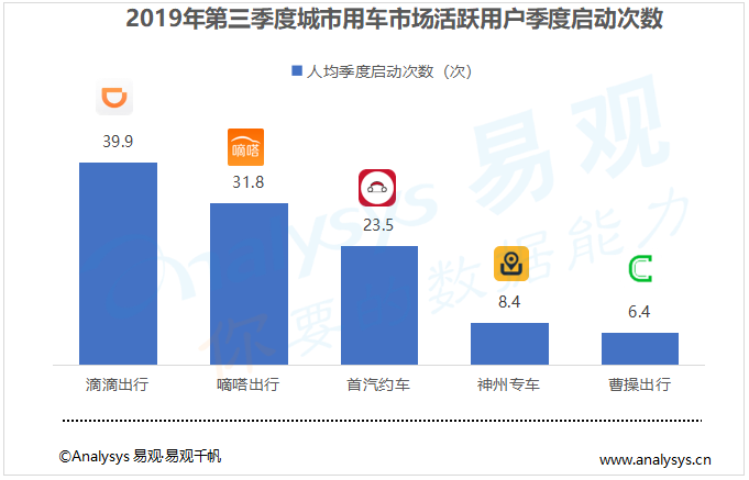 在用戶粘性方面,滴滴出行以人均季度啟動次數(shù)39.9次為列第一、嘀嗒出行和首汽約車分別以31.8次、23.5次位居第二位、第三位。