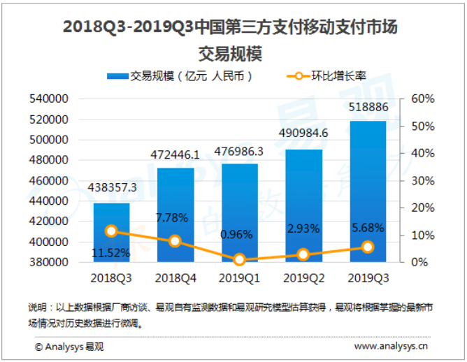 根據(jù)易觀發(fā)布的《中國(guó)第三方支付移動(dòng)支付市場(chǎng)季度監(jiān)測(cè)報(bào)告2019年第3季度》數(shù)據(jù)顯示,2019年第三季度,中國(guó)第三方支付移動(dòng)支付市場(chǎng)交易規(guī)模達(dá)518886億元人民幣,環(huán)比升高5.68%。