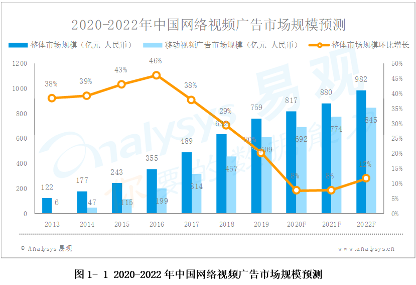 根據(jù)Analysys易觀發(fā)布的《中國網(wǎng)絡(luò)視頻市場趨勢預(yù)測2020-2022》顯示,2019年中國網(wǎng)絡(luò)視頻廣告市場規(guī)模達到759億元,其中移動視頻廣告市場規(guī)模為609億元。預(yù)計到2022年中國網(wǎng)絡(luò)視頻廣告市場規(guī)模將達到982億元,其中移動視頻廣告市場規(guī)模為845億元,占比約為86%。