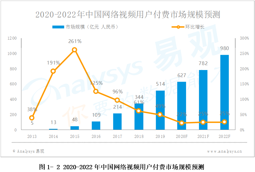 在網(wǎng)絡(luò)視頻用戶付費市場,2019年中國網(wǎng)絡(luò)視頻付費市場規(guī)模為514億元,預(yù)計到2022年中國網(wǎng)絡(luò)視頻付費市場規(guī)模將達到980億元。