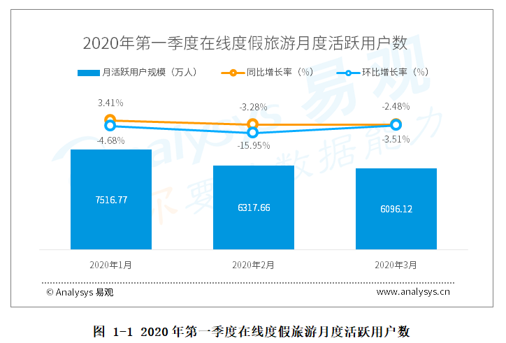 Analysys易觀分析認(rèn)為,2020年第一季度度假旅游市場沒有延續(xù)往年春節(jié)檔的輝煌戰(zhàn)績,整體市場籠罩在疫情影響下。在線度假旅游用戶紛紛取消春節(jié)返鄉(xiāng)、旅游計劃。伴隨數(shù)百萬訂單退改,度假旅游廠商平臺短期內(nèi)出現(xiàn)退訂高峰,1月度假旅游市場的用戶整體活躍度出現(xiàn)同比小幅增長。1月26日文化和旅游部宣布全國暫停境內(nèi)外跟團游和“機票+酒店”半自助旅游產(chǎn)品,度假旅游業(yè)務(wù)處于停滯狀態(tài),致使2月環(huán)比出現(xiàn)明顯下滑,跌幅達到15.95%。隨著國內(nèi)疫情得到有效控制,各行開始復(fù)工復(fù)產(chǎn),度假旅游作為非剛需產(chǎn)業(yè),恢復(fù)周期較長,短期內(nèi)用戶出游表現(xiàn)并不積極,整體市場降幅較上月縮減,逐步解凍。疫情之下,度假旅游業(yè)態(tài)遭遇重創(chuàng),旅游經(jīng)濟大幅回落損失慘重,各大廠商積極出臺各項應(yīng)對措施,共同面對處理旅游疫情危機,在停頓修整期間打磨內(nèi)功,助推旅游行業(yè)復(fù)蘇。