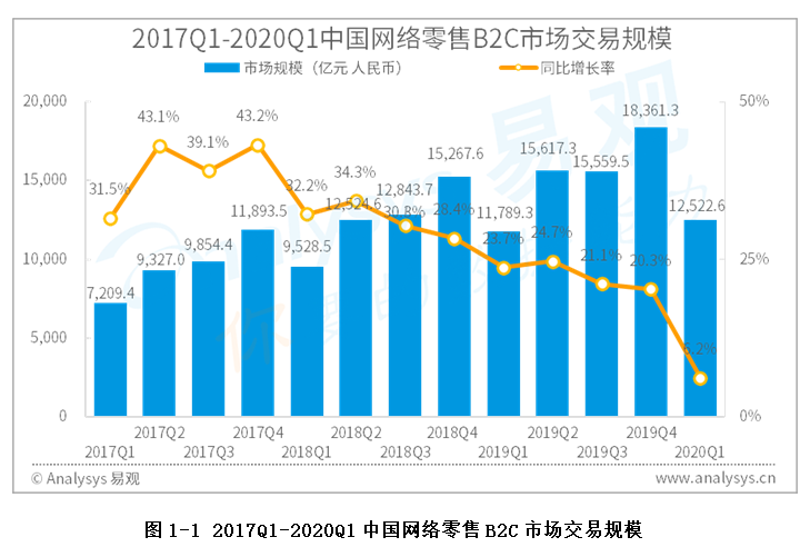 根據(jù)Analysys易觀發(fā)布的《中國網(wǎng)絡(luò)零售B2C市場季度監(jiān)測報(bào)告2020年第1季度》數(shù)據(jù)顯示,2020年第1季度,中國網(wǎng)絡(luò)零售B2C市場交易規(guī)模為12522.6億元人民幣,同比增長6.2%。