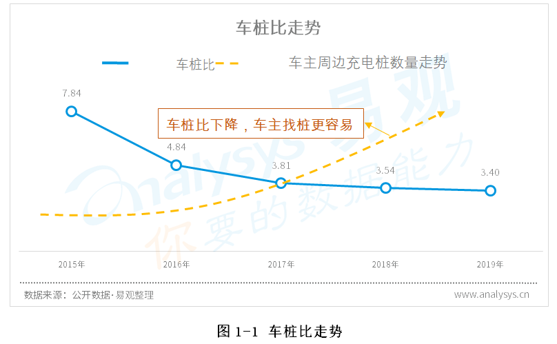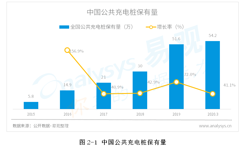 截至2020年3月,全國充電基礎(chǔ)設(shè)施累計數(shù)量為126.7萬臺,同比增加37.6%。其中,公共類充電樁54.2萬臺。受疫情影響,對比2019年底只增加了5%,但受益于去年下半年的高速增長,同比依然增加41%。新基建概念拉動大量資金涌入,隨著復(fù)工復(fù)產(chǎn)的全面展開,充電樁建設(shè)在下半年建設(shè)必然提速。預(yù)計2020年、2021年公共充電樁保有量分別達到93.9、164.3萬,增幅為82%、75%。但Analysys易觀認為隨著新能源汽車?yán)m(xù)航里程提升、快充技術(shù)發(fā)展,以及大數(shù)據(jù)匹配技術(shù)的進步,Analysys易觀認為未來并非需要實現(xiàn)“一車一樁”,車樁比突破2:1之后便可實現(xiàn)較好的用車體驗。
