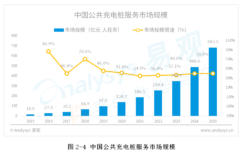 2019年,中國公共充電樁市場服務(wù)市場規(guī)模達到97.6億人民幣。隨著新能源汽車?yán)m(xù)航的增加,電動車的應(yīng)用場景將為更為豐富,新能源汽車充電量需求的增幅將會高于車輛增幅。到2025年,Analysys易觀測算該塊市場規(guī)模將達到683.5億人民幣,是目前的7倍。