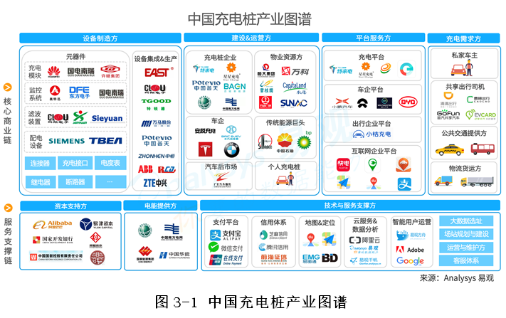 新基建的推出,激發(fā)充電樁市場進入新一輪競爭。國家電網(wǎng)、南方電網(wǎng)、特來電、星星充電皆等宣布了新一輪大規(guī)模建設(shè)計劃。另外,華為、阿里、寧德時代等跑步進入該領(lǐng)域。如華為發(fā)布HiCharger直流快充模塊,螞蟻金服成為簡單充第二大股東。充電樁產(chǎn)業(yè)圖譜不斷刷新,目前充電樁產(chǎn)業(yè)鏈直接的參與者主要分為設(shè)備制造方、建設(shè)&運營方、平臺服務(wù)方、充電需求方,間接的參與者有資本支持方、電能提供方、技術(shù)與服務(wù)支撐方。