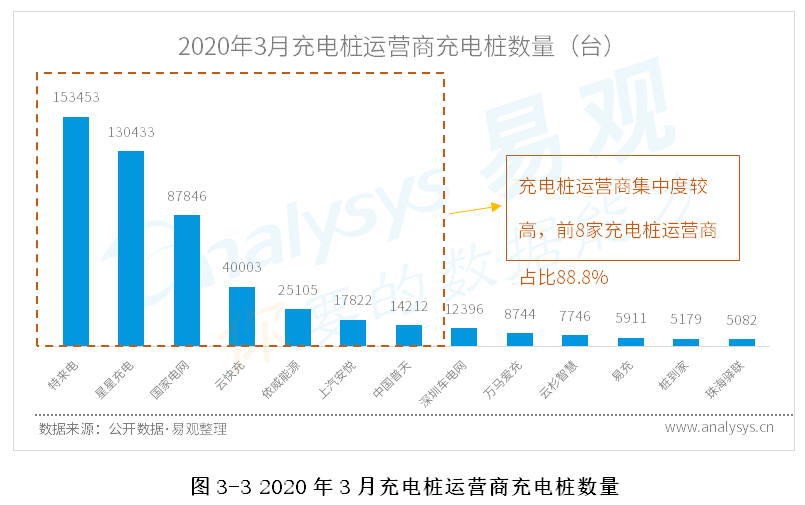 目前,充電樁運營和充電平臺市場集中度已相對較高。截止到2020年3月,全國充電運營企業(yè)所運營充電樁數(shù)量超過1萬臺的共有8家,這8家運營商占總量的88.8%。其中特來電運營15.3萬臺、星星充電運營13.0萬臺、國家電網(wǎng)運營8.8萬臺。并且據(jù)公開信息和易觀訪談數(shù)據(jù)測算,2019年,我國公共充電樁累計充電量69.63億kWh,特來電、星星充電兩家占比超過40%,特來電充電量增長2倍,星星充電充電量增長超過3倍。