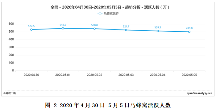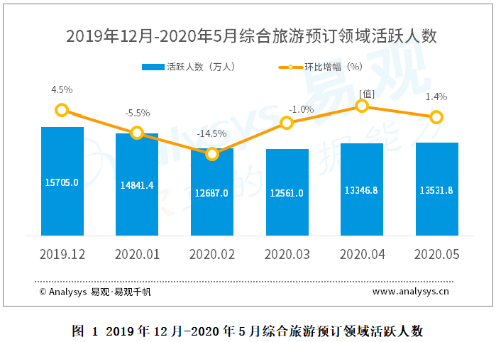 往年第二季度,在清明、五一、端午三個小長假的帶動作用下,游客出游意愿高漲,今年年初受疫情影響,打亂原有市場節(jié)奏,旅游市場熱度驟降,隨著疫情得到有效控制,市場逐步解凍。根據(jù)易觀千帆數(shù)據(jù)顯示,自4月起,綜合旅游預(yù)訂領(lǐng)域活躍用戶環(huán)比重回正向增長,顯露出回暖跡象,增長幅度雖小,但也給旅游市場帶來了復(fù)蘇的積極信號。