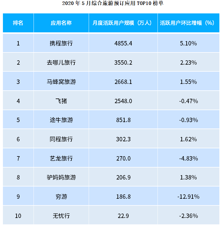 在5月的綜合旅游預(yù)訂APP榜單中,攜程旅行以4855.4萬活躍用戶規(guī)模高居榜首,去哪兒旅行、馬蜂窩旅游分別以3550.2萬、2668.1萬活躍用戶位列二、三位。TOP10平均月活達(dá)到1546.2萬,旅游市場活力亟待復(fù)蘇。在疫情之下,直播帶貨成了促進(jìn)消費的重要方式,各行涌入直播賽道,全民直播已成趨勢。越來越多的旅游企業(yè)開始審視直播這一全新的旅游營銷模式,紛紛加入直播大軍,在疫情逆勢中尋找市場機會,促進(jìn)旅游市場振興發(fā)展。