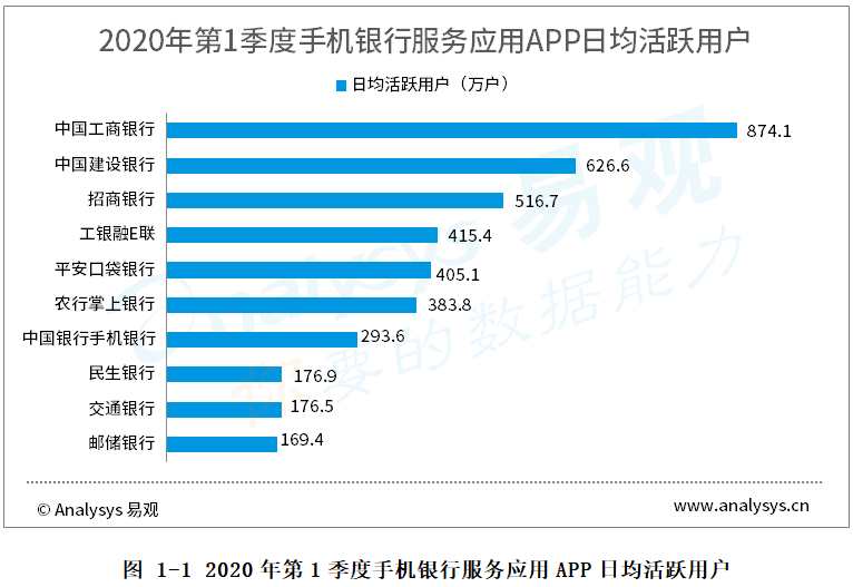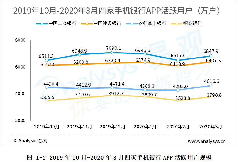 易觀分析認為,2020年第1季度,各行手機銀行既保障客戶日常的金融需求,還提供了多種疫情相關金融、生活類服務。隨著疫情得以控制,客戶金融需求在短期下降之后即出現較為明顯的回升,帶動第1季度手機銀行服務行業(yè)活躍用戶呈現一定的增長。