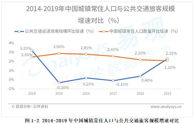 根據(jù)公開數(shù)據(jù)顯示,2014-2019年間,伴隨中國城鎮(zhèn)化進程不斷推進,城鎮(zhèn)常住人口數(shù)量有7.5億增長至8.5億,實現(xiàn)13%的快速增長。與之相反,這六年間我國公共交通運送乘客規(guī)模僅增長2%,甚至在部分年份出現(xiàn)負增長。也就是說,在城鎮(zhèn)人口數(shù)量及對應的出行需求快速上漲情況下,公共交通服務的人次并未出現(xiàn)與之匹配的增長。