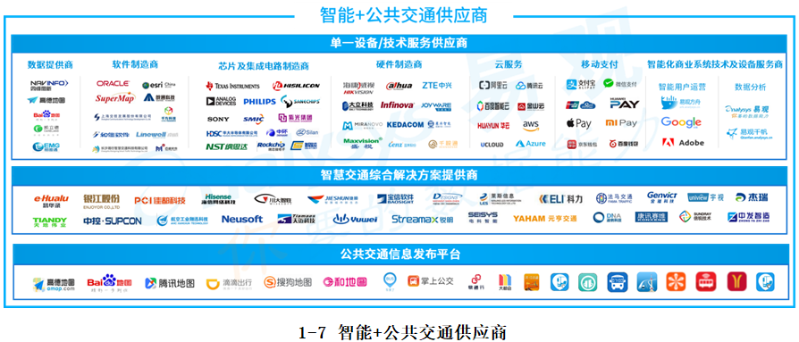 智能+公共交通供應商大體分為三類:單一設備/技術服務供應商、綜合型解決方案服務供應商,公共交通信息服務平臺。