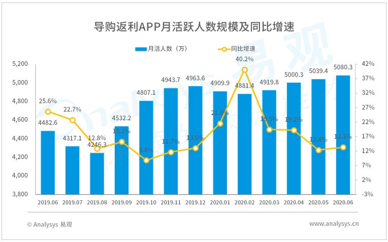 疫情的到來(lái)讓越來(lái)越多人的消費(fèi)觀念發(fā)生了改變,人們無(wú)論收入是否受到巨大影響,都紛紛對(duì)未來(lái)謹(jǐn)慎起來(lái),在消費(fèi)上更加理性、克制,省錢(qián)與攢錢(qián)也變得更深入人心。疫情之后,淘寶特價(jià)版、拼多多等主打低價(jià)的平臺(tái)逐漸成為消費(fèi)者的新寵。與此同時(shí),另外一類(lèi)可以幫助消費(fèi)者省錢(qián)的移動(dòng)應(yīng)用也迎來(lái)了用戶的快速增長(zhǎng),即線上導(dǎo)購(gòu)平臺(tái)。易觀千帆數(shù)據(jù)顯示,疫情爆發(fā)以來(lái),線上導(dǎo)購(gòu)返利平臺(tái)的APP活躍用戶取得了明顯的增長(zhǎng),到今年6月月活規(guī)模達(dá)到了歷史新高的5080.3萬(wàn),同比去年6月上漲了13.3%。