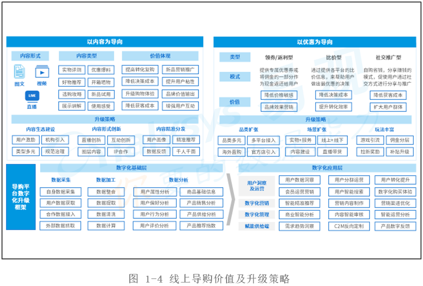 線上導(dǎo)購(gòu)主要通過(guò)以內(nèi)容為導(dǎo)向和以優(yōu)惠為導(dǎo)向兩種方式來(lái)吸引用戶實(shí)現(xiàn)導(dǎo)購(gòu),不同的方式對(duì)于平臺(tái)與消費(fèi)者的價(jià)值體現(xiàn)各有不同,相應(yīng)的升級(jí)策略也存在差異。但是,不同的平臺(tái)都在通過(guò)數(shù)字化升級(jí)來(lái)提升運(yùn)行效率,實(shí)現(xiàn)精細(xì)化的管理與運(yùn)營(yíng)。