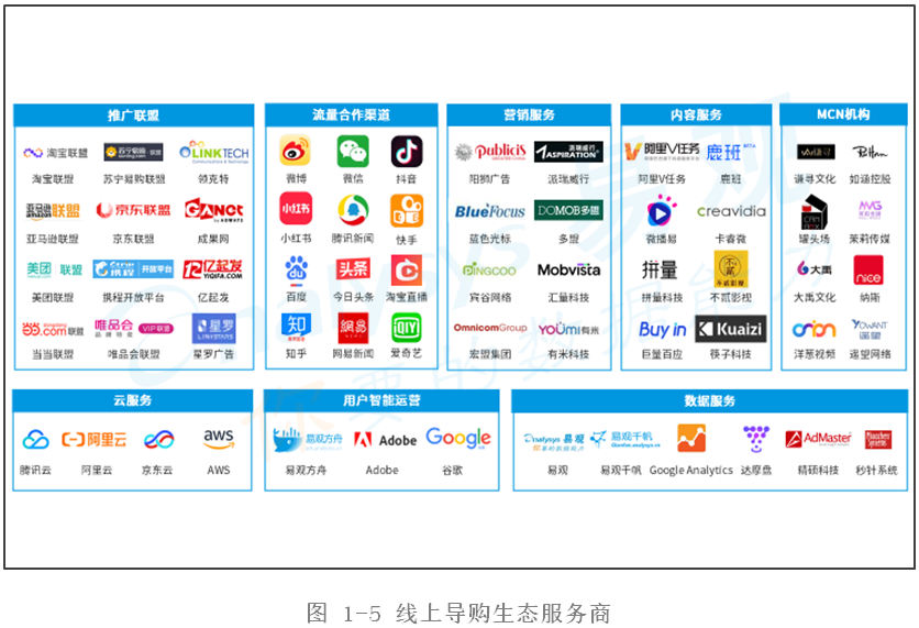 線上導(dǎo)購(gòu)的核心產(chǎn)業(yè)鏈較為簡(jiǎn)單,主要模式是導(dǎo)購(gòu)平臺(tái)接入聯(lián)盟平臺(tái)來(lái)進(jìn)行分傭合作。但隨著短視頻與直播的發(fā)展,內(nèi)容導(dǎo)購(gòu)的形式變得越來(lái)越豐富,結(jié)合導(dǎo)購(gòu)平臺(tái)衍生的展示廣告、效果營(yíng)銷(xiāo)及內(nèi)容營(yíng)銷(xiāo)等業(yè)務(wù)的快速增長(zhǎng),導(dǎo)購(gòu)生態(tài)的服務(wù)供應(yīng)商體系逐漸壯大了起來(lái)。