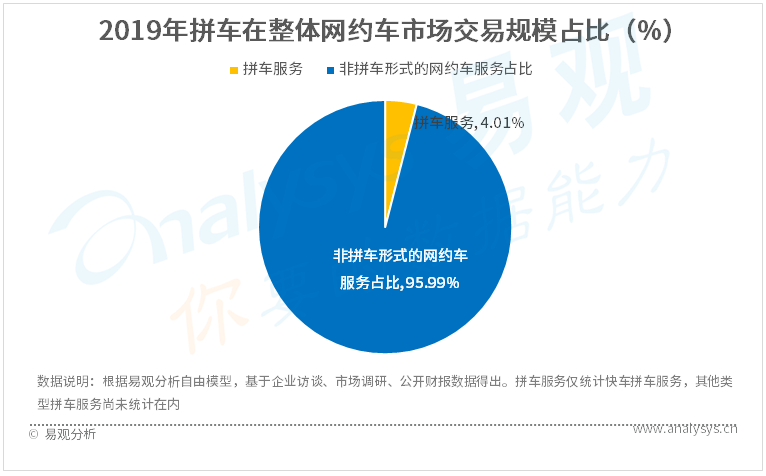 根據(jù)易觀分析,2019年拼車領(lǐng)域訂單僅占據(jù)網(wǎng)約專快車市場4.01%的市場份額,市場潛在發(fā)展空間較大。