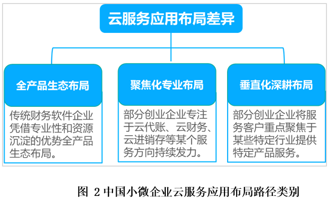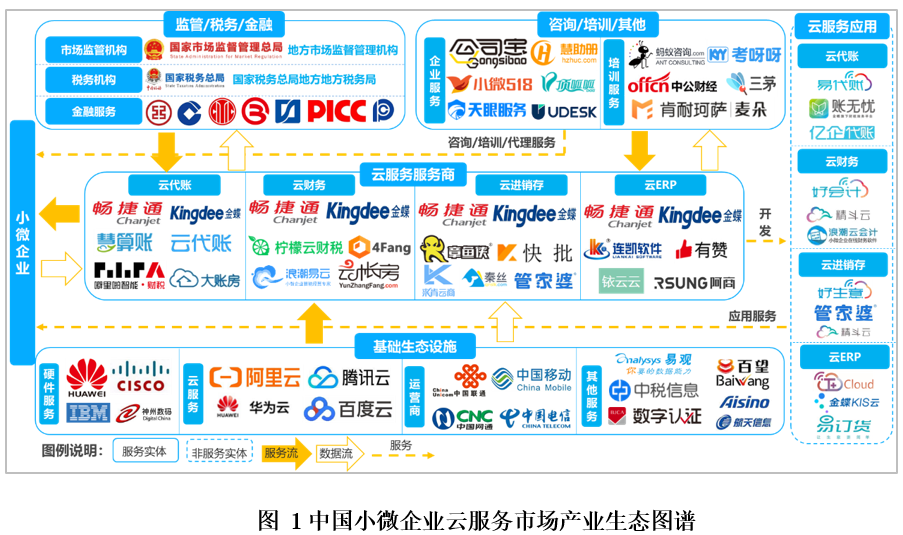 目前小微企業(yè)云服務(wù)市場(chǎng)核心服務(wù)方式云服務(wù)廠商,主要提供云代賬、云財(cái)務(wù)、云進(jìn)銷存、云ERP等服務(wù)方向,云服務(wù)廠商借助云服務(wù)應(yīng)用服務(wù)于小微企業(yè)財(cái)稅及一體化的運(yùn)營(yíng)管理,其中云代賬的主要服務(wù)商有暢捷通易代賬、金蝶、慧算賬等企業(yè),云財(cái)務(wù)主要服務(wù)廠商及產(chǎn)品有暢捷通好會(huì)計(jì)、浪潮云會(huì)計(jì)、金蝶精斗云等,云進(jìn)銷主要服務(wù)廠商及產(chǎn)品如暢捷通好生意、任我行的管家婆、金蝶的精斗云,云ERP主要服務(wù)廠商及產(chǎn)品有暢捷通的T+cloud、金蝶Kis云、銥云科技的易訂貨等。